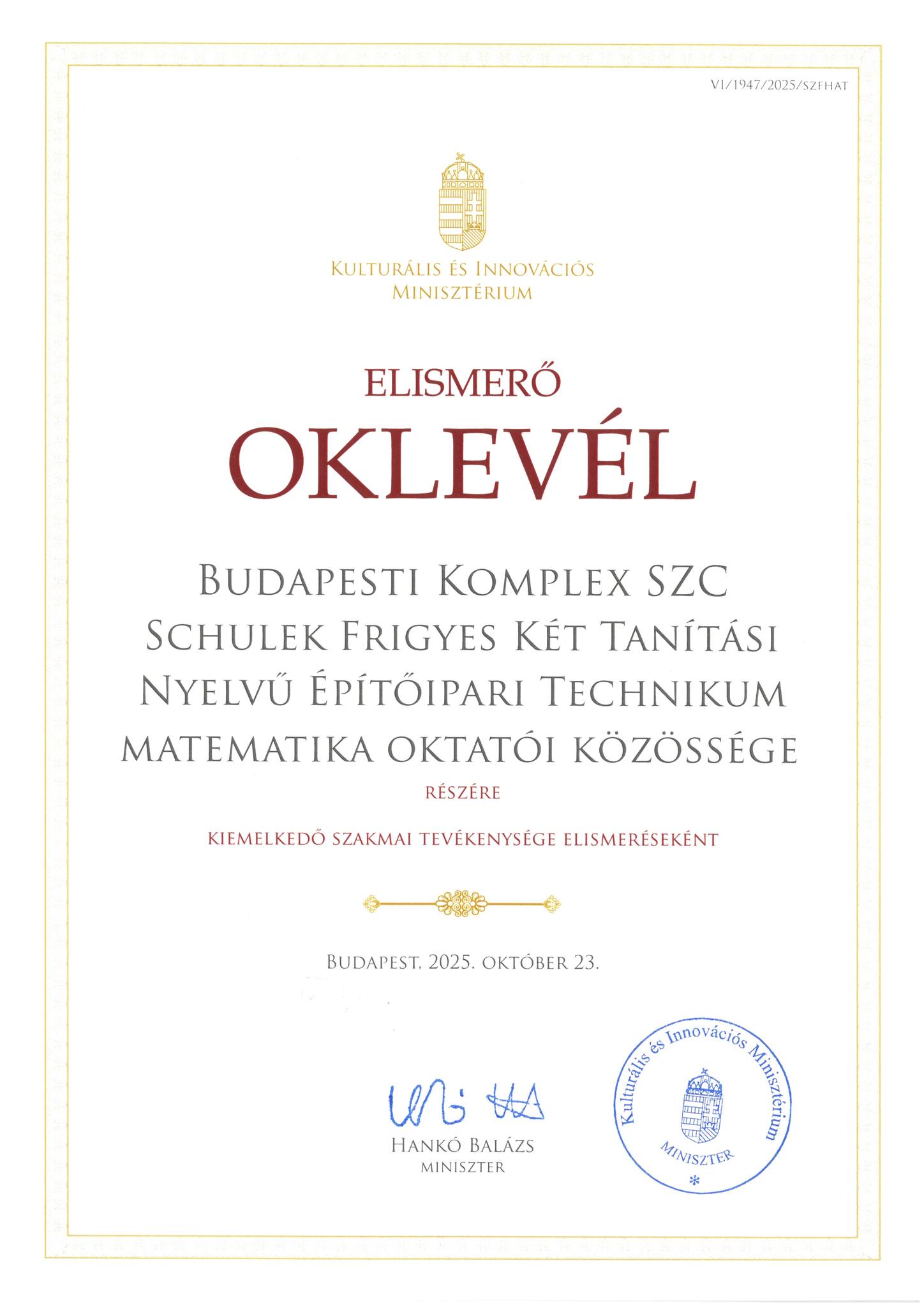 elnyerte a Miniszter Elismerő Oklevelét